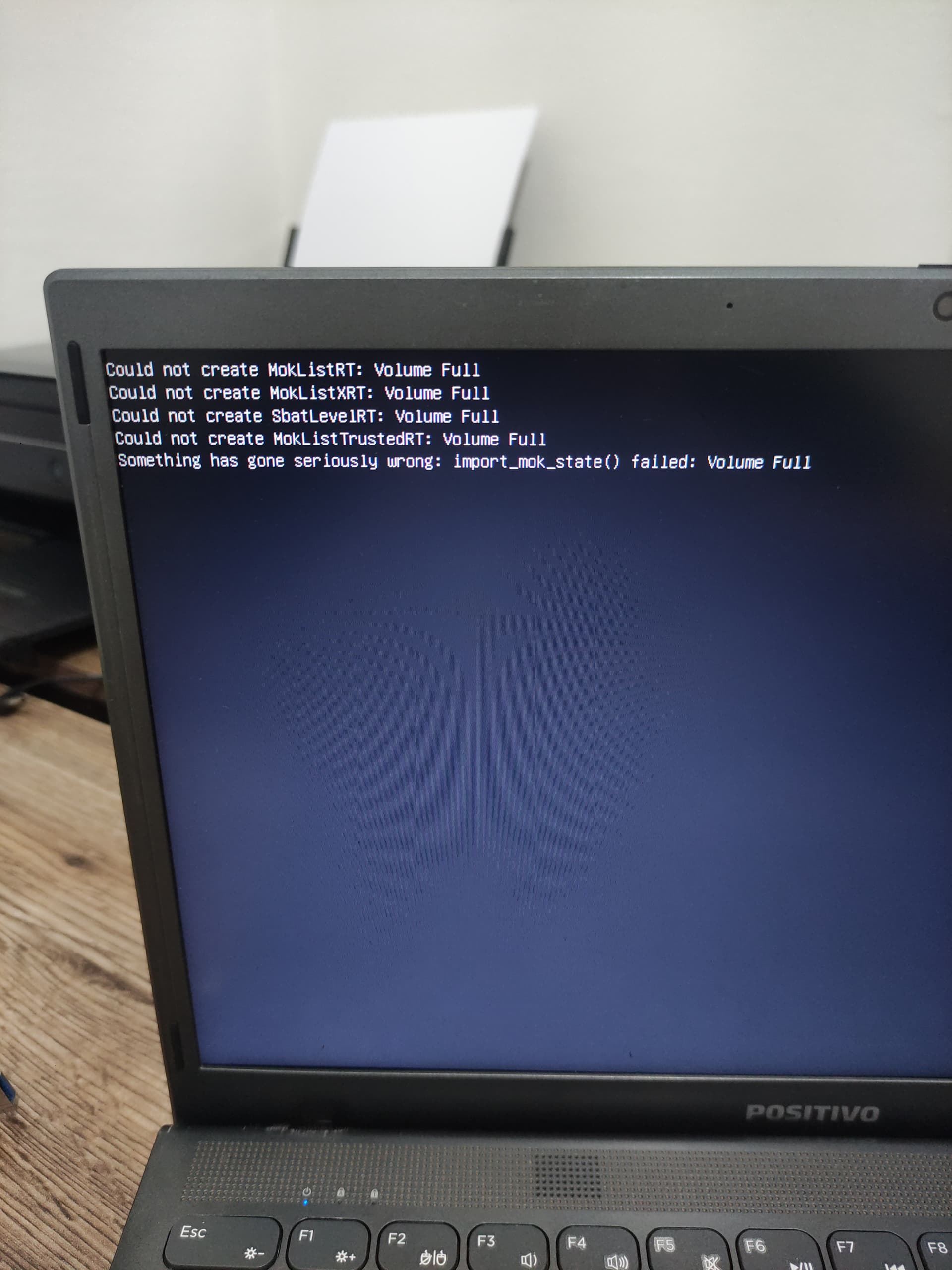 Pessoal, estou com esse problema ao tentar instalar o linux mint xfce no notebook. Sempre quando dou boot pelo pendrive para fazer a instalação em dual boot com o windows 10 esse erro da foto aparece e o notebook desliga! Não consigo inicializar nenhuma iso (mint, lubuntu ou até mesmo o gparted e bootrepair). Em instalações anteriores eu segui alguns passos desativando o secure boot e limpando as keys ficando todas em 0 e funcionou, mas agora nem isso está resolvendo. Alguém poderia me ajudar, por favor?