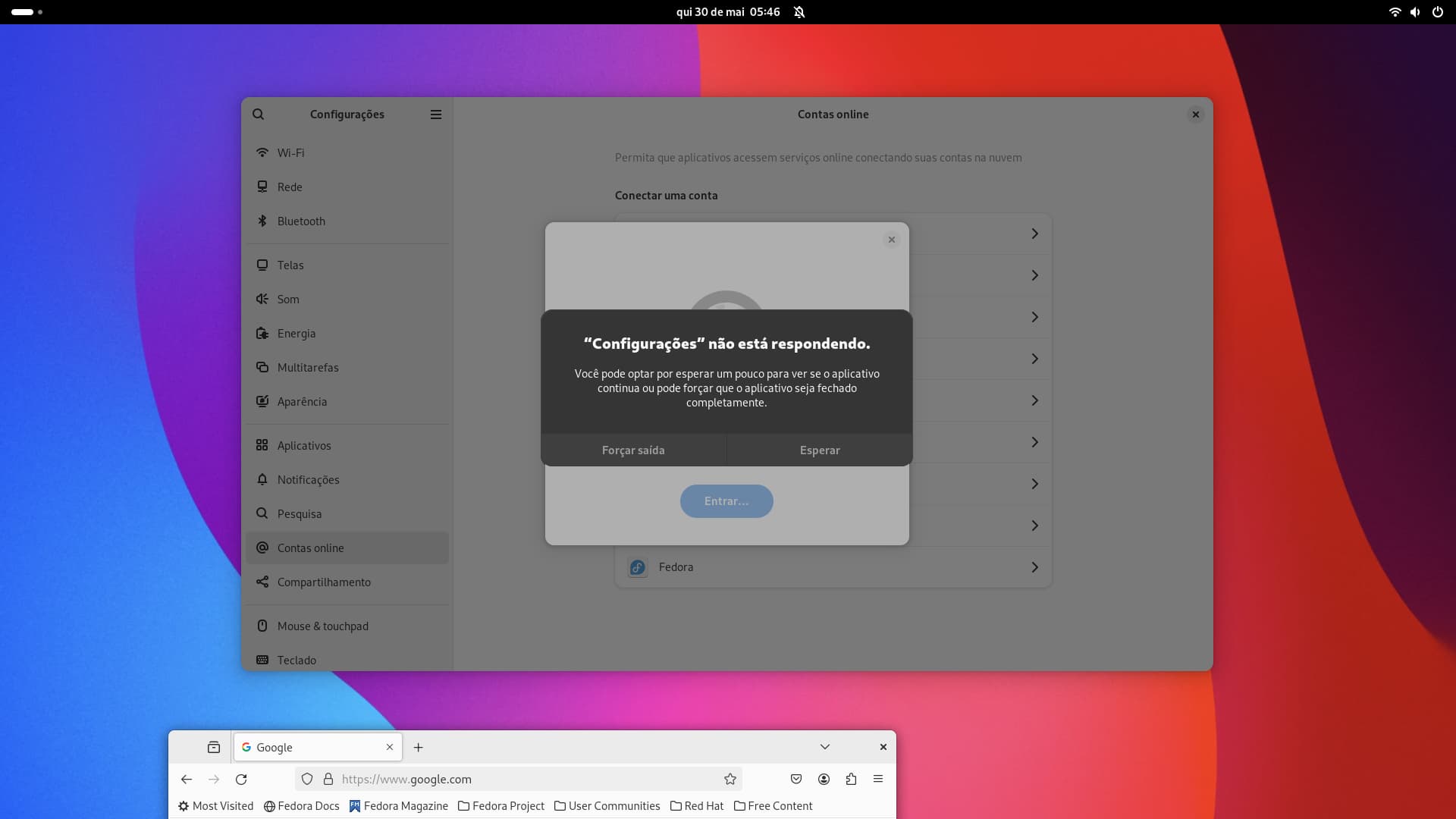 Acontece que agora o gnome settings quebra quando eu do permissão ao google para deixar o gnome acessar.