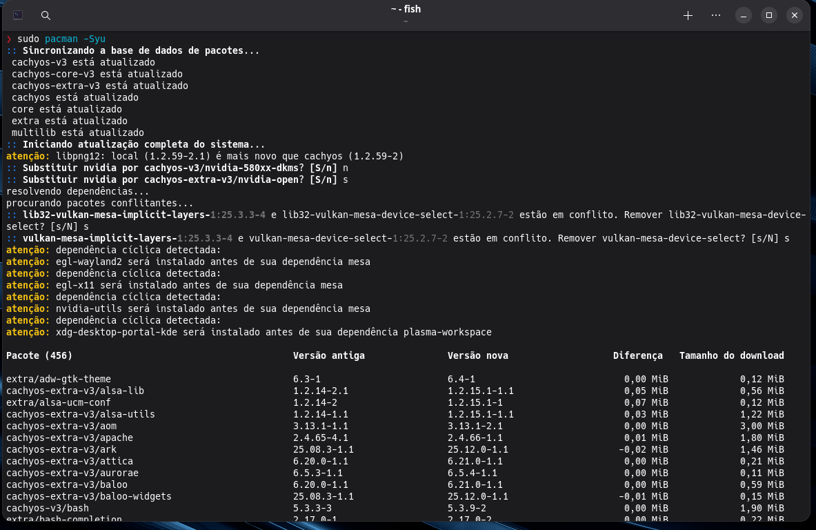 Boa tarde a todos. Estou com esse problema há 3 dias, tento atualizar meu sistema (cachyos - arch linux) porém há um conflitos entre os pacotes. Por favor poderiam me ajudar?