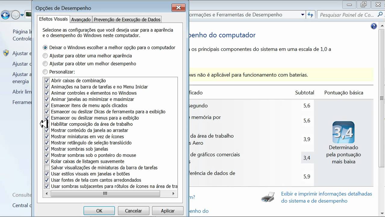 Vai em painel de controle >> Sistema >> Configurações avançadas do sistema >> em Desempenho clica em “Configurações” >> Depois marca a caixa “Ajustar para obter melhor desempenho”: