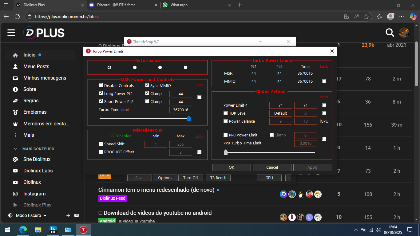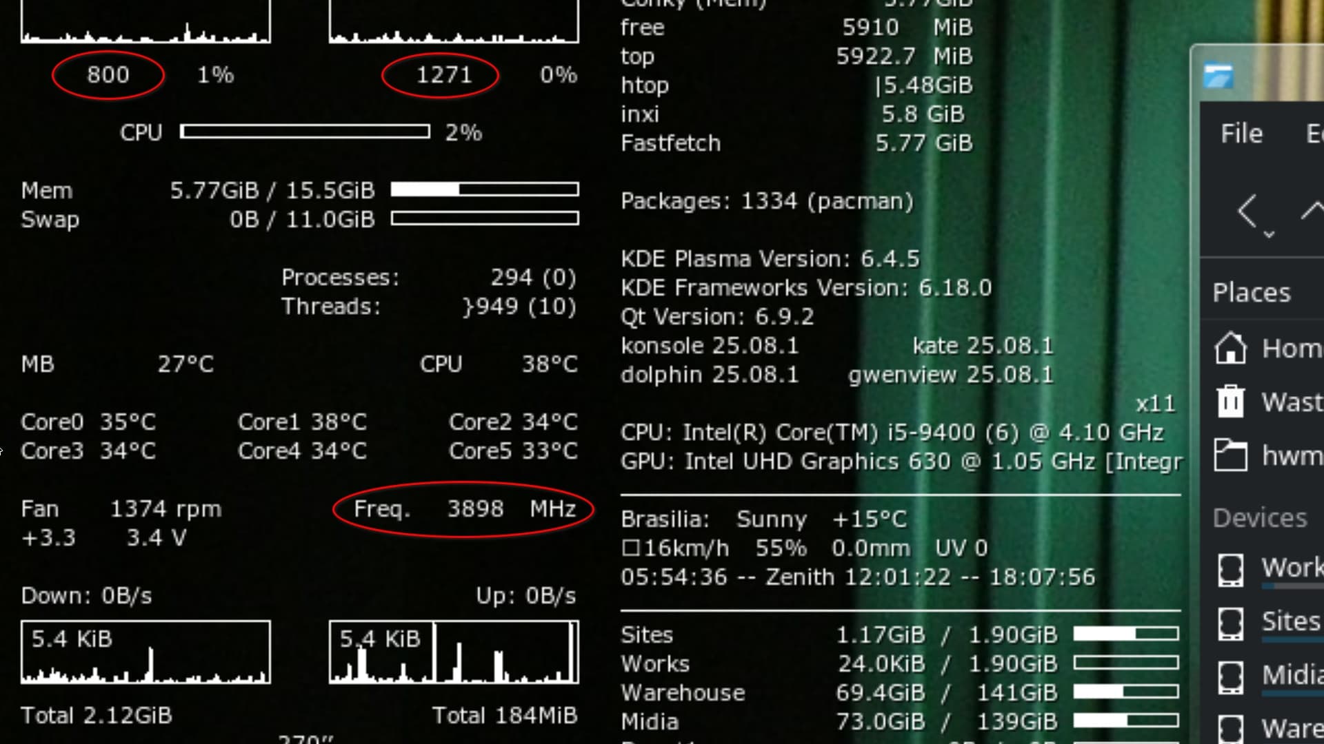 Eu não realizo tarefas pesadas, e não jogo. – Em todas as distros, sempre foi normal ficar perto de 800 MHz a maior parte do tempo, com picos momentâneos de quase 4.000 MHz – exceto no Slackware, que ficava o tempo todo perto de 4.000 MHz.