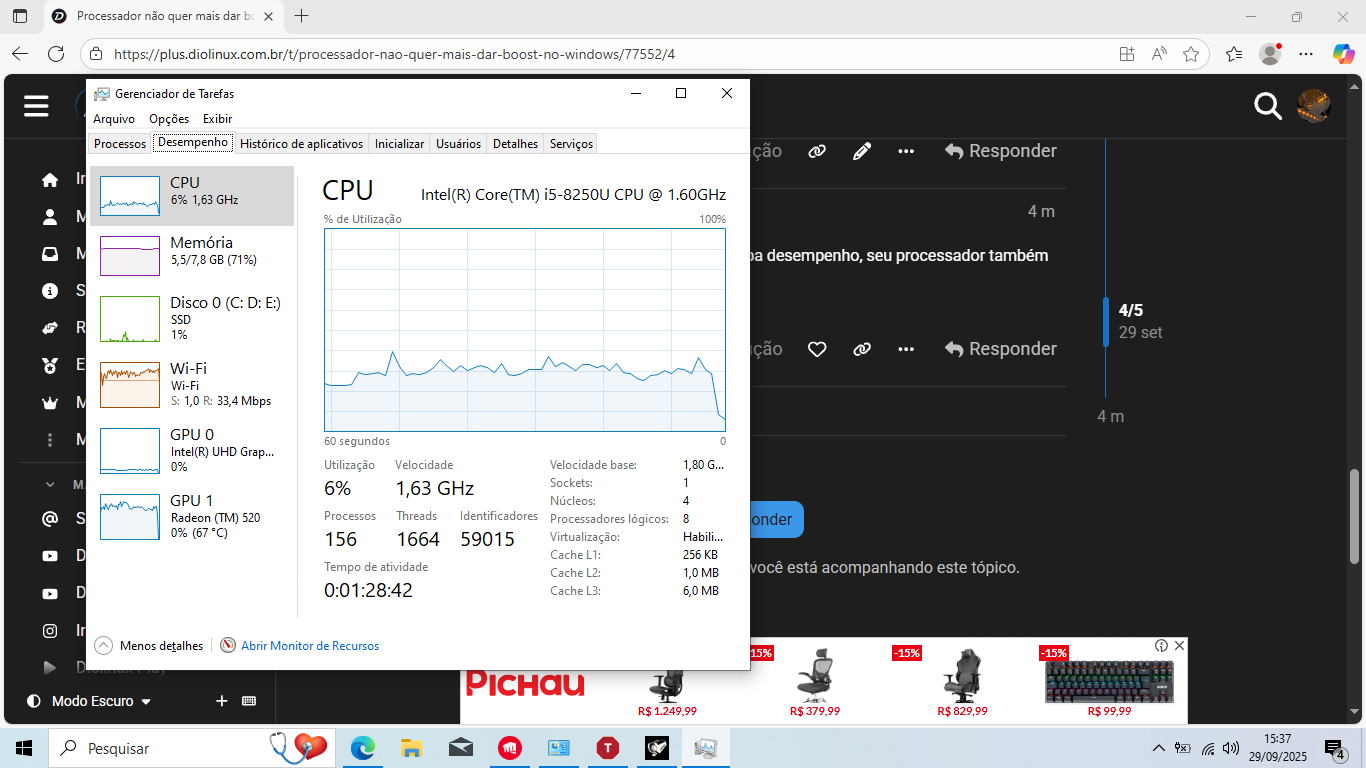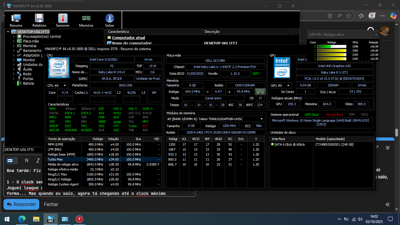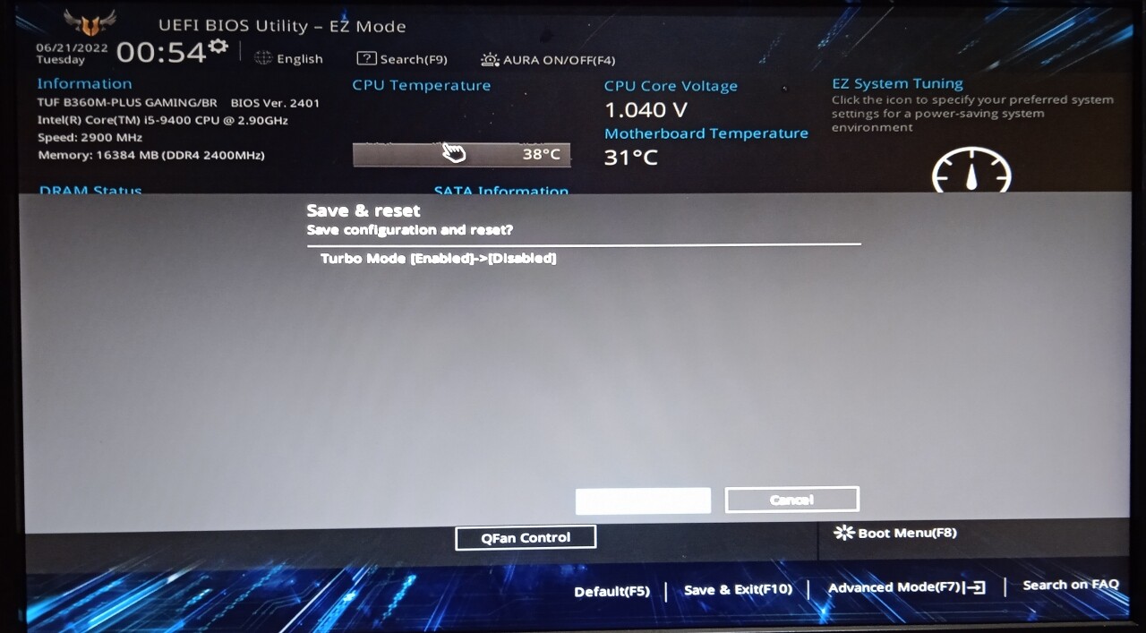 Minha CPU é Intel i5-9400 (sem nenhuma letra no final), e creio que o Turbo Boost veio ativado, pois sempre oscilou de 800 a 4.100 MHz, desde os primeiros dias (Janeiro 2020) – sem que eu tivesse mexido no UEFI Bios Utility Setup da placa-mãe Asus: