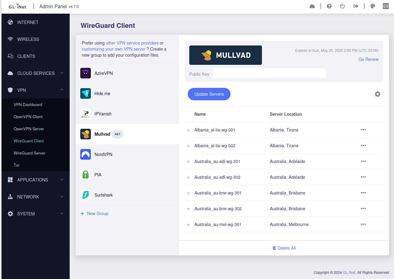 Um destes logins vai direto no roteador OpenWRT GL-iNet Flint 2 (GL-MT6000), o que me permite ter toda a rede Wi-Fi e Cabeada na VPN com extrema facilidade em gerenciar a mudança de servidores conforme necessário