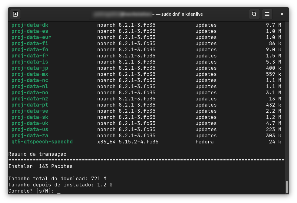 Segue o exemplo de uma tentativa de instalar o Kdenlive usando o dnf: