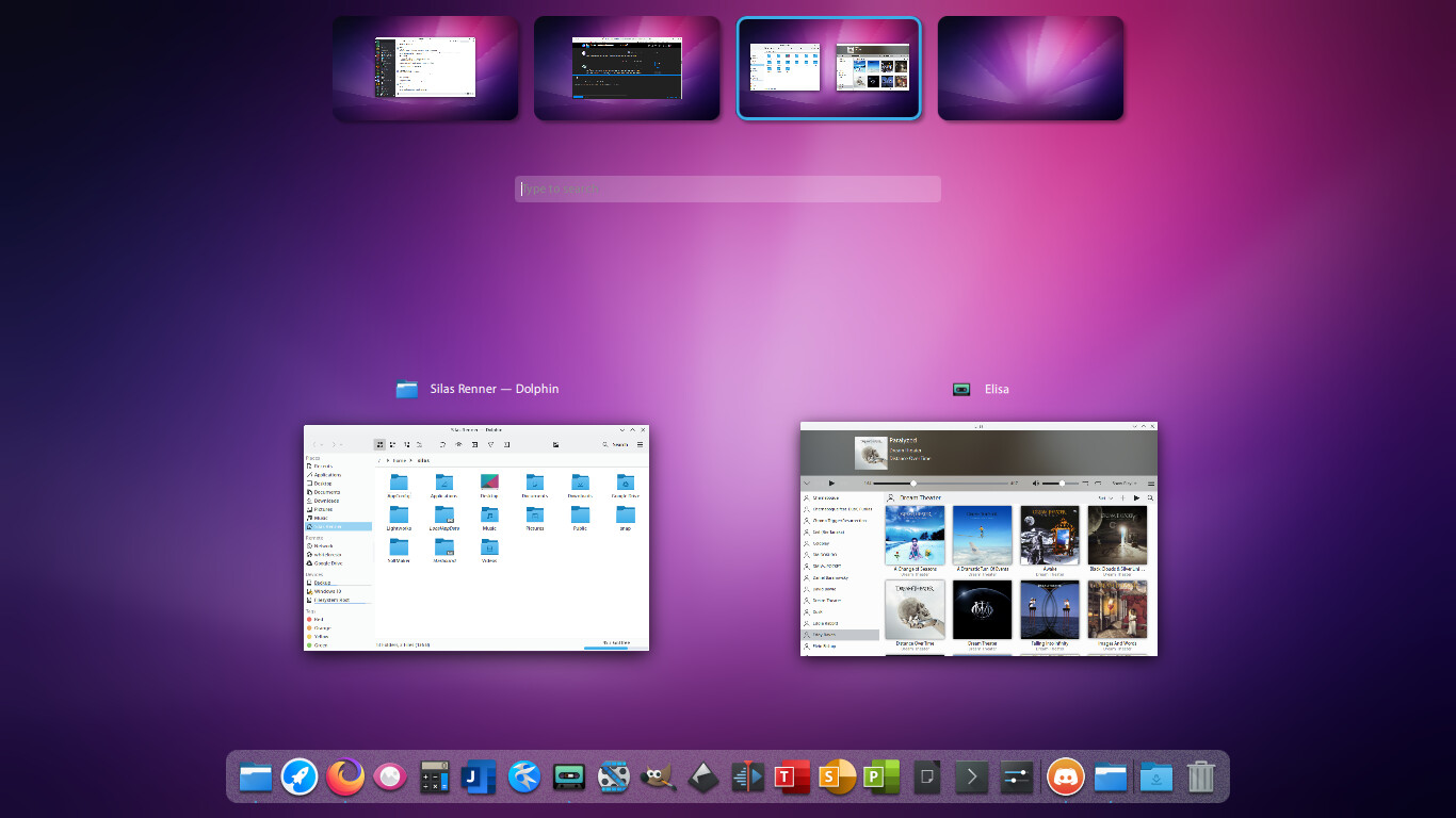 Três perguntas, se não se importa: 1) Como você deixou o overview assim (imagem 3)? Com os desktops em cima, a barra de pesquisa e a dock? 2) sabe se é possível ocultar a dock quando o sistema não está em overview? 3) Amo o painel transparente, mas como fica quando você tem uma aplicação em tela cheia? ela permanece transparente?