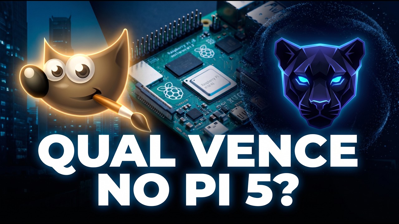 Rodando com UBUNTU 26.04 LTS, fiz testes de estresse real na bancada usando o Pi 5 para ver se a GPU VideoCore VII e o processador dão conta ao mesmo tempo avaliando o novo app VS consagrados. Coloquei ele pra abrir catálogos de quase 500MB fechado para gráfica em CMYK e disputar performance abrindo arquivos de Photoshop. Testei o GIMP, o Krita e o novo Fog Panther.