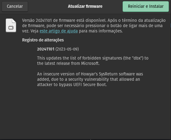 Acabo de instalar o Pop!OS, ele roda como dual boot ao lado do Ubuntu, e existe esse Firmware que tem uma atualização disponível. Ele pede para reiniciar e instalar, porém, quando eu clico no botão e reinicio,e volto para essa tela, o Firmware continua desatualizado. Procurei em vários lugares e não encontrei nada muito esclarecedor, se alguém puder me ajudar, eu agradeço!