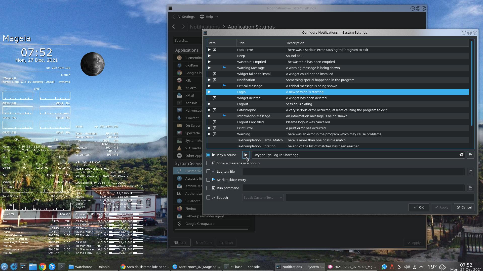 Quanto ao som eu não sei, porque aqui tá desativado junto das notificações, mas deve ser a opção na central de configurações onde tem áudio, a opção sons de notificação. O meu fica o sininho com o traço bem na barra inferior, qualquer coisa dá um toque aqui que caçamos juntos. Sou usuário Plasma mas muda demais alguns sub-menus que as vezes não achamos mesmo.