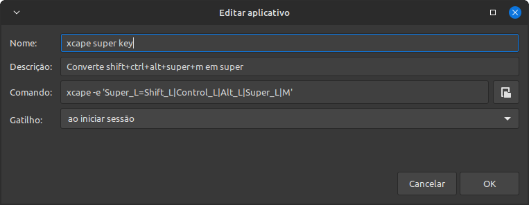 4° - O comando xcape é basicamente um script, então você terá que executar o comando sempre para que ele fique rodando em background. E para evitar que você sempre tenha que rodar este script, abra o aplicativo “Sessão e Inicialização” abra a aba “Início automático de aplicativos” clique em “adicionar” e agora você irá colocar o mesmo comando do passo 3 para rodar sempre que seu sistema inicializar. Deve ficar assim:
