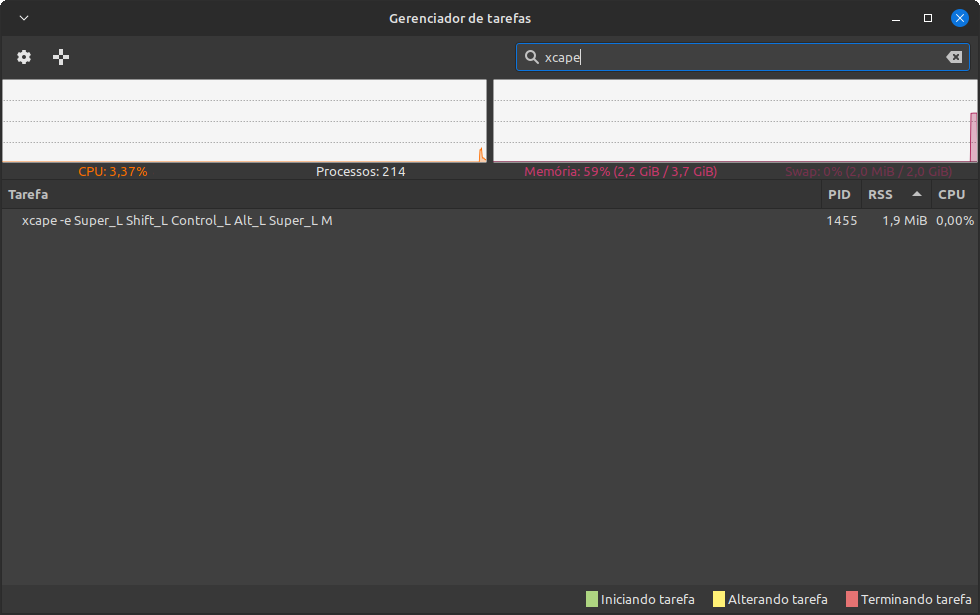 Para ter certeza de que o comando está rodando corretamente, abra o gerenciador de tarefas, pesquise por xcape e lá aparecerá o comando rodando em background:
