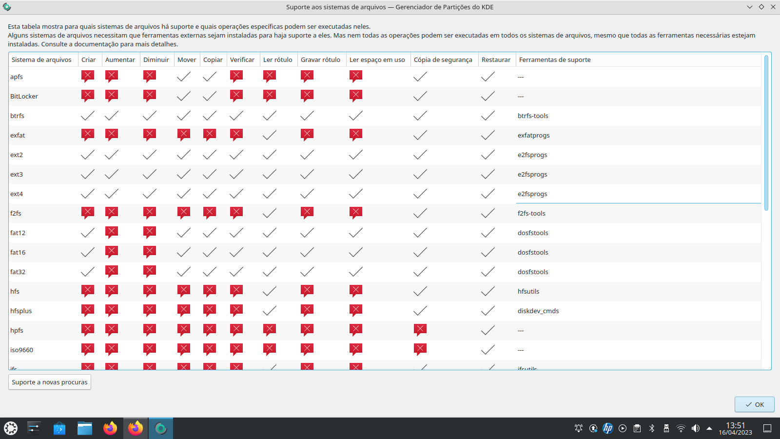 A imagem mostrando o suporte de filesystem do partição menager KDE a seguir, o Gparted tmb tem uma tabelinha deste tipo para olhar.