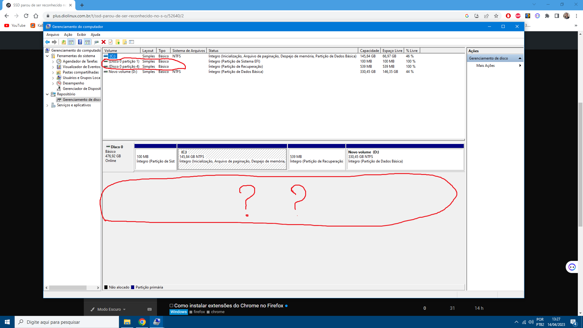 Mas esse é o problema; Não aparece mais nessa sessão de gerenciamento (depois que atualizei), nem mesmo no diskpart do CMD. Nem mesmo quando o PC está inicializando ele mostra o SSD em questão, e antes aparecia, mesmo o SO não estando nele. Observe que, quando eu entro na BIOS, ele aparece normalmente, tudo certinho…