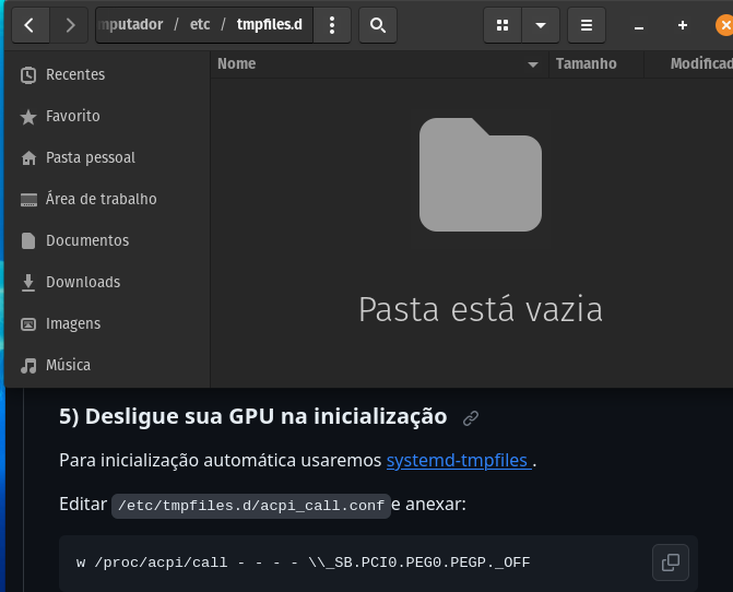 Atualmente estou parado no passo 5, meu sistema não tem o arquivo “acpi_call.conf” em /etc/tmpfiles.d/, não sei o quê fazer a partir de agora, pensei em criar o arquivo acpi_call.conf, mas não sei se eu estaria fazendo certo ao fazer isso…