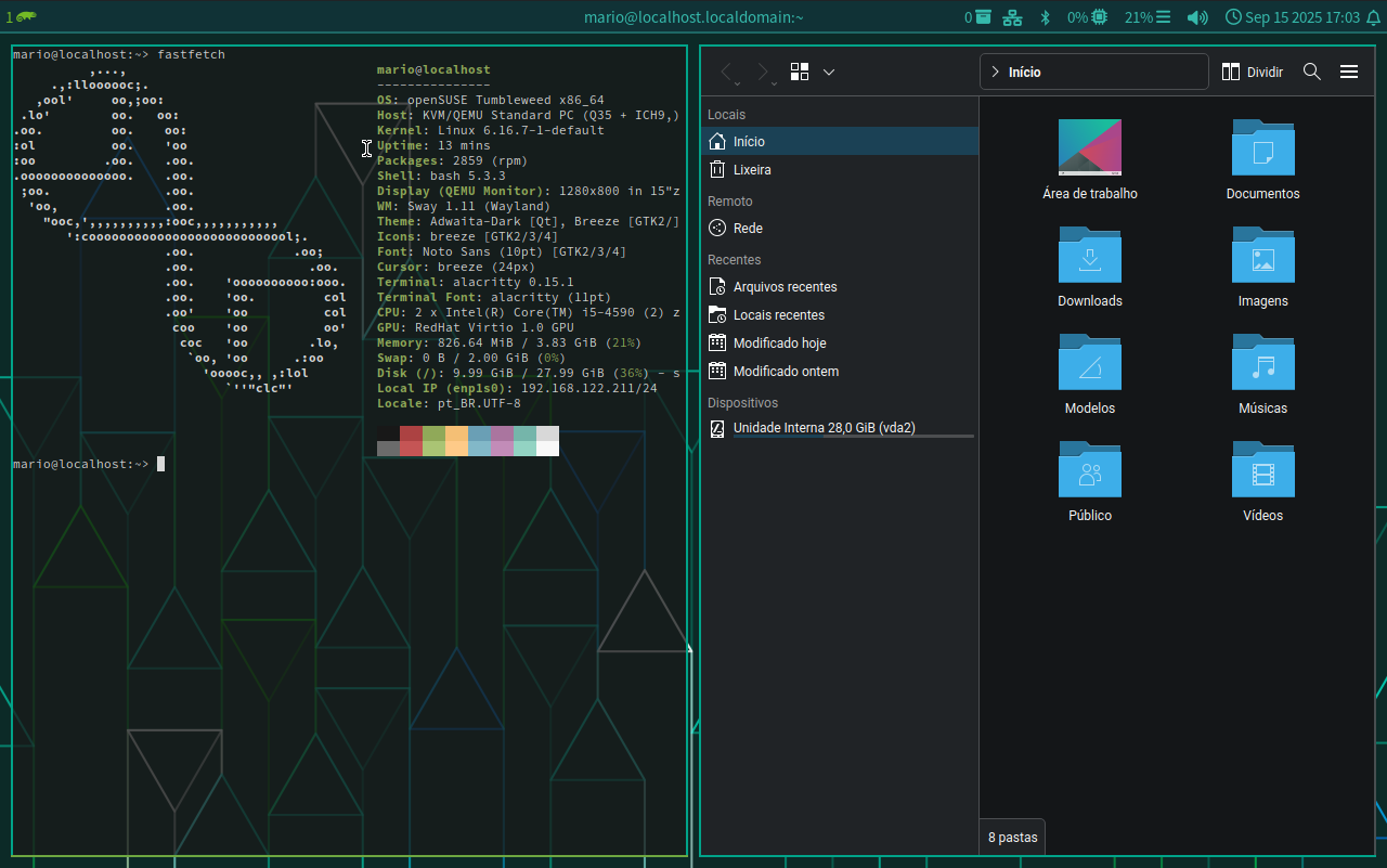 O Opensuse já vem com o Sway pronto e configurado para ser instalado. Instalei numa vm com o Opensuse Tumbleweed que já tinha o KDE Plasma instalado. Não sou especialista em tiling, mas achei que os caras mandaram muito bem. Achei que ficou bem legal.