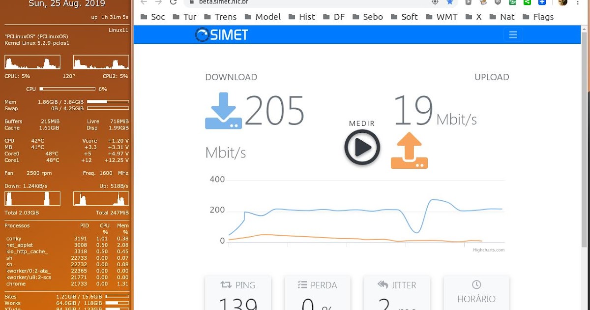 Para documentar com mais riqueza de informações, executo o comando manualmente (para copiar os dados) – e aproveito para capturar a tela com o Conky, nome da distro, do Kernel etc.: