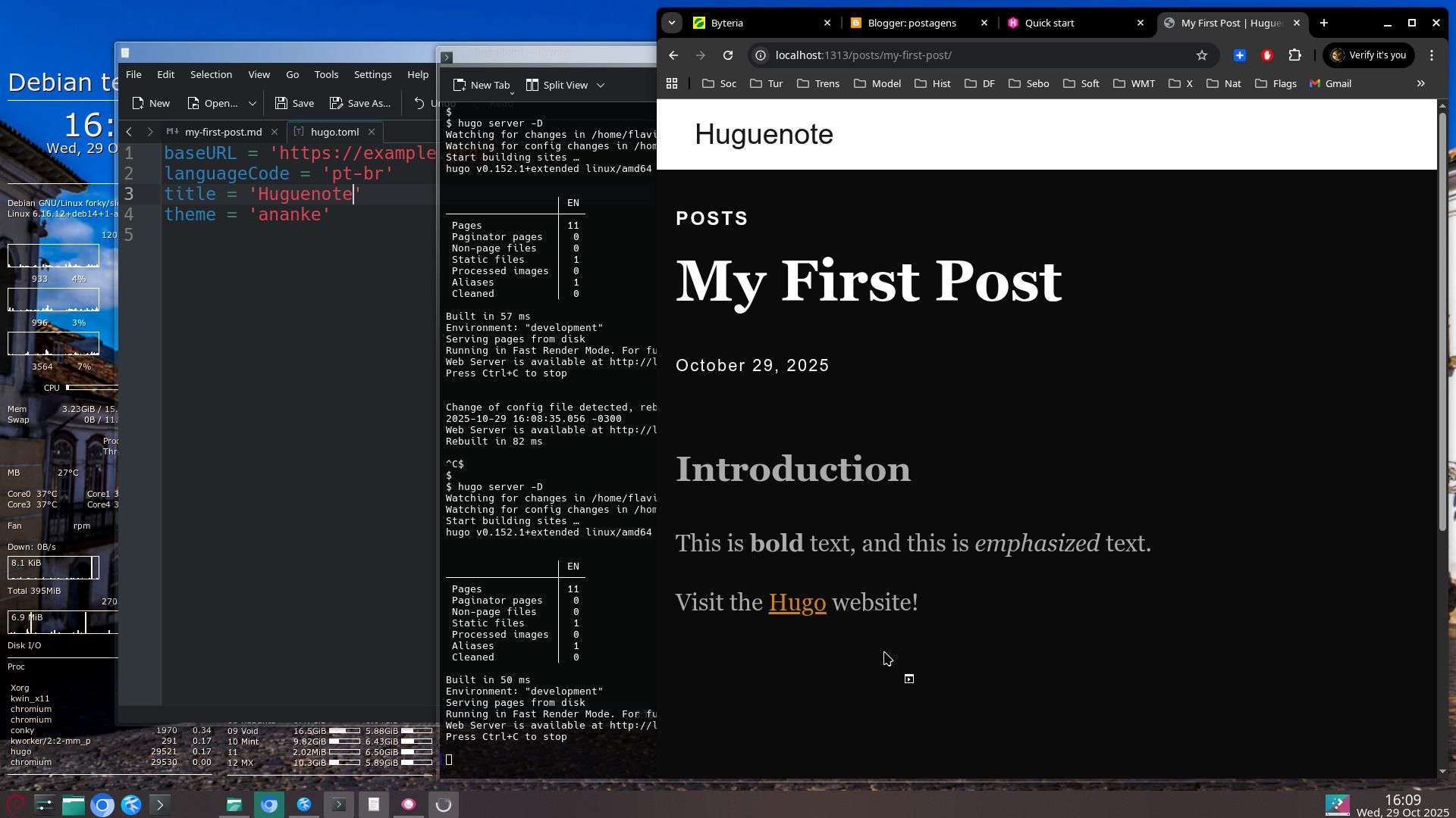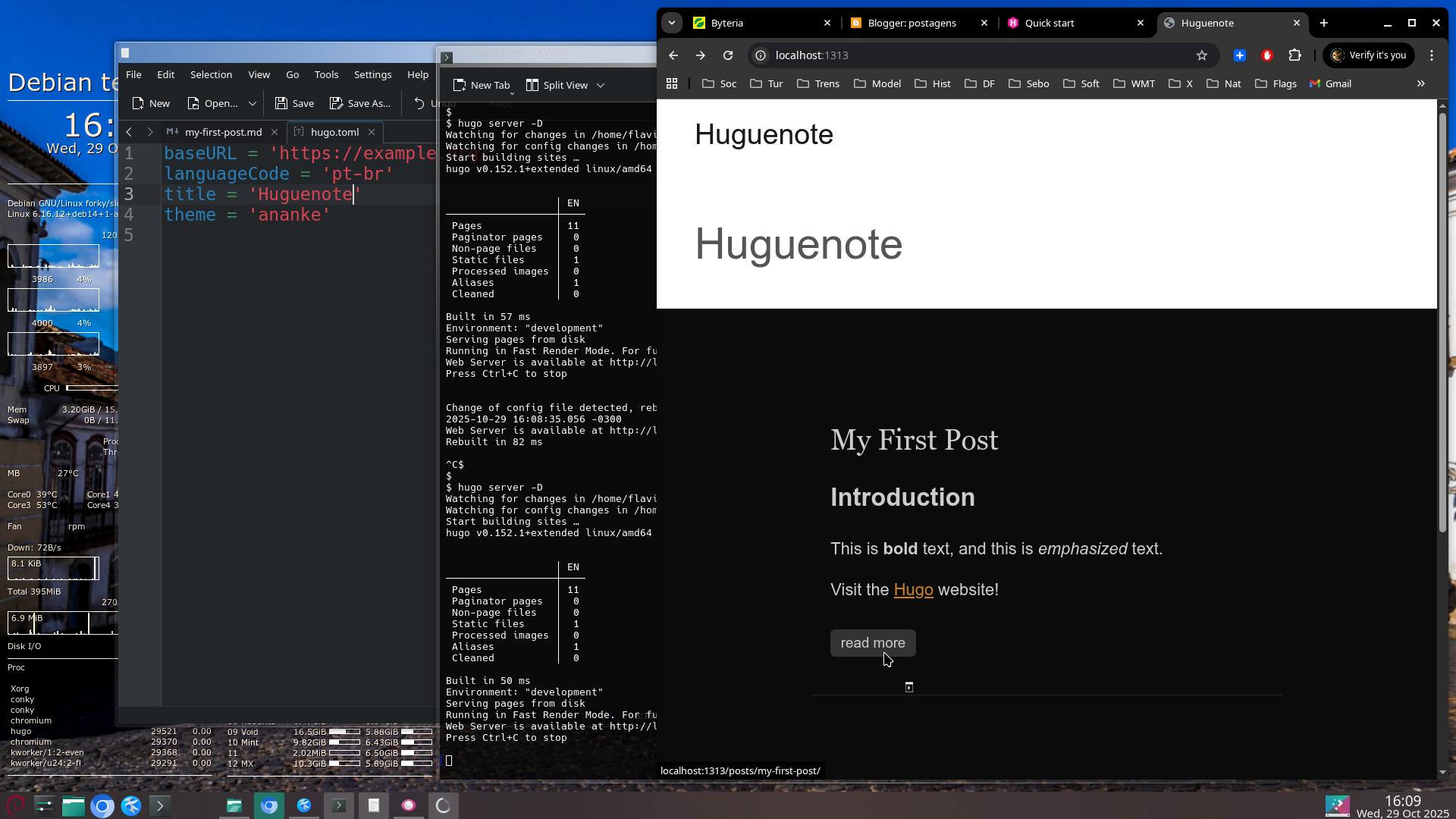 Simplesmente adorei usar o Hugo. Ele é muito fácil de ser instalado, tem um webserver que roda no localhost:1313 que permite visualizar as alterações, e ele gera o site muito rápido, com tempos que podem chegar a milissegundos. E relatei o processo de criação do Blog aqui:
