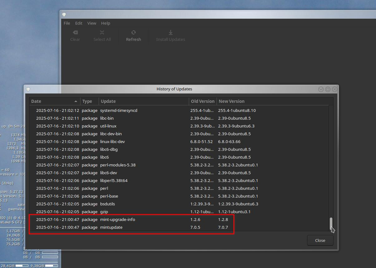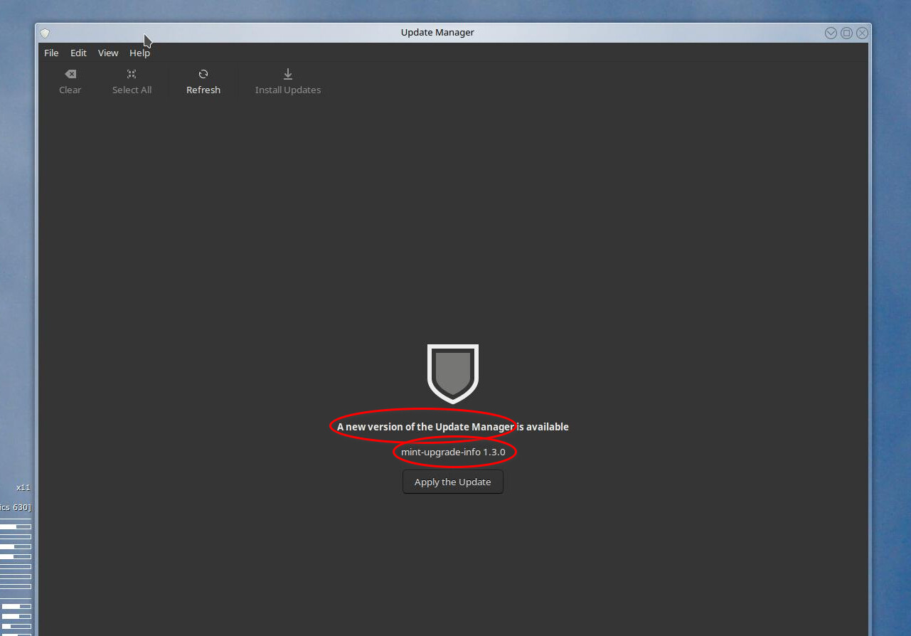 Essas atualizações incluíam o pacote “mint-upgrade-info (1.2.9) to 1.3.0”, mas não o Gerenciador de Atualizações (mintUpdate). – Normal, em qualquer “lojinha”. – Suspeitei desde o princípio…