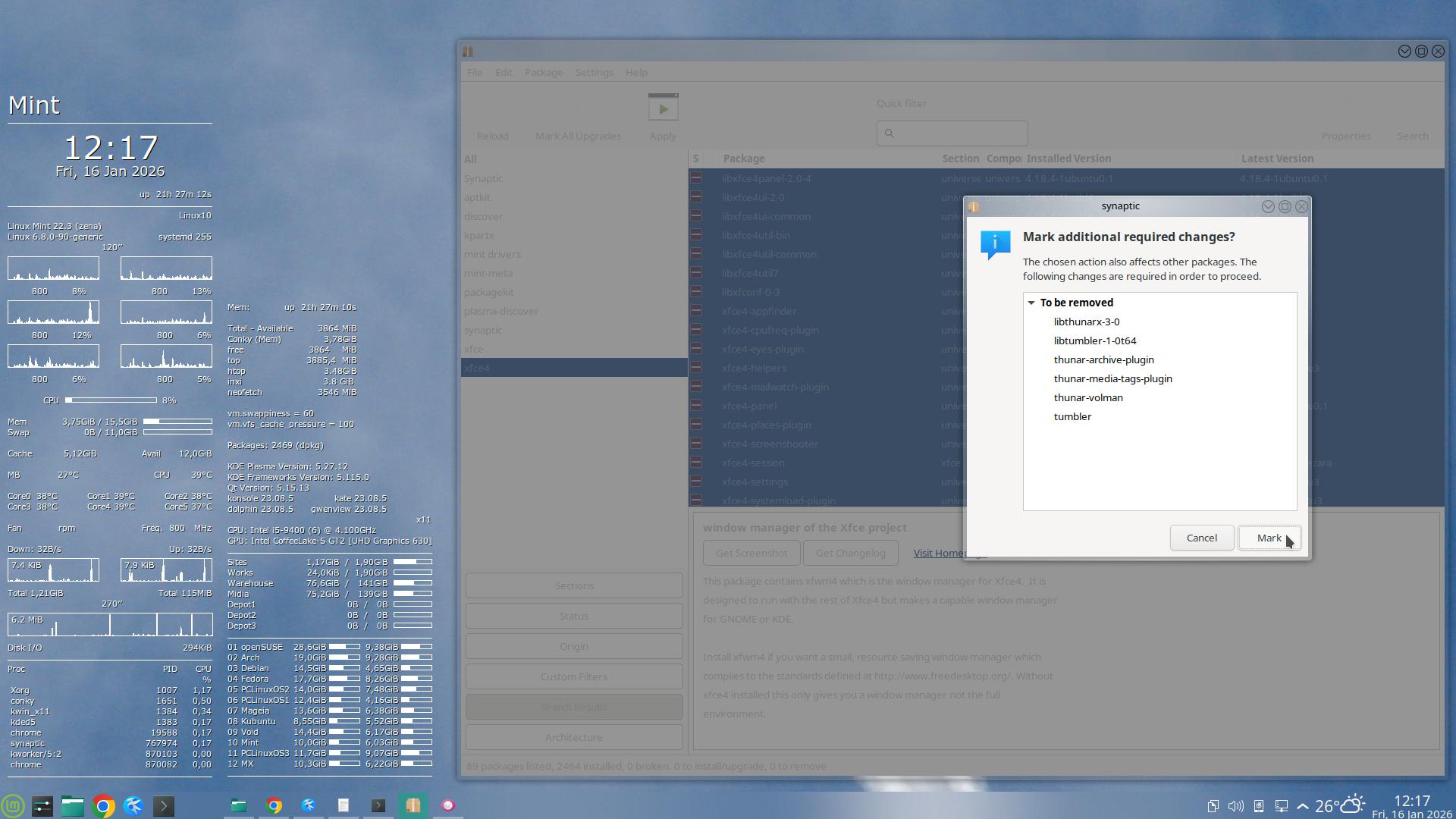 Ainda falta destrinchar mais alguma coisa, antes de remover todos os pacotes chamados “Xfce4” – que no ano passado aceitavam ser removidos, sem tugir nem mugir.