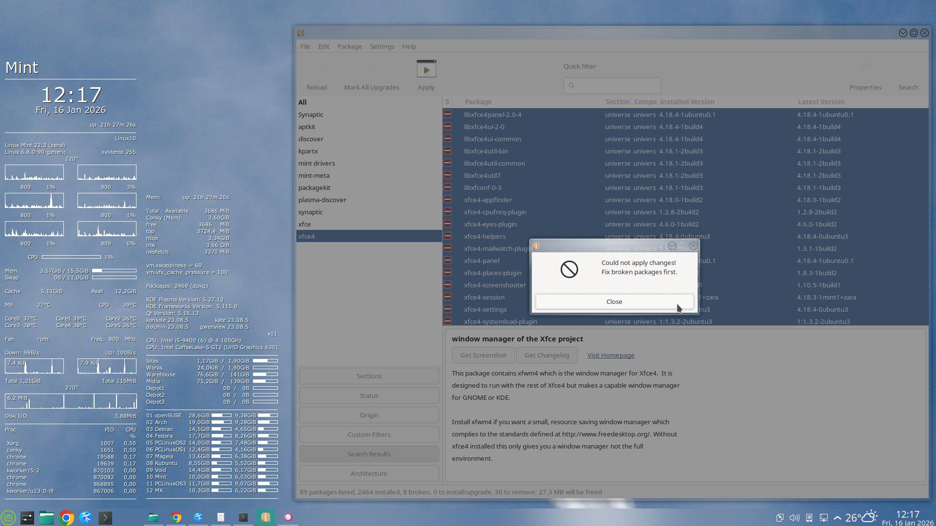 Além disso, existem o dpkg, o apt, o aptkit – além de pacotes do PackageKit, do Xfce / Gnome, do KDE Plasma (Discover) etc. – que o Mint não removeu completamente, ou que eu não removi completamente etc. – Quanto mais “camadas” superpostas, mais enrolada é a coisa… e mais perigoso, mexer nesse castelo de cartas, sem desabar tudo.