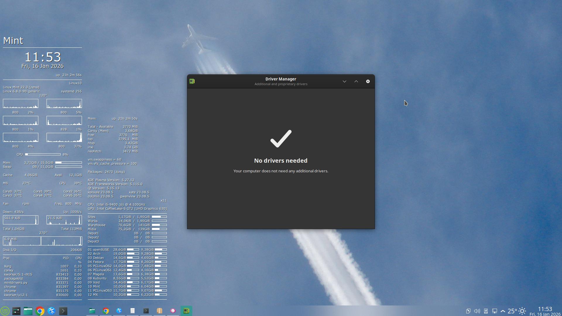 Pois é! – Fiquei meio na dúvida. – Mas a verdade é que o Mint nunca achou necessidade de instalar nenhum “driver” adicional para o meu hardware – nem hoje, nem no ano passado, nem em 2020-2021:
