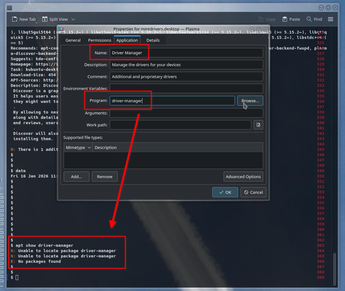 Esse gerenciador foi outro labirinto. – No Menu e na barra de títulos de sua janela, ele se chama “Driver Manager”. – Nas propriedades do lançador, diz que ele vai usar o programa “driver-manager”. – O comando “whereis” diz que ele está em “/usr/bin/driver-manager”…