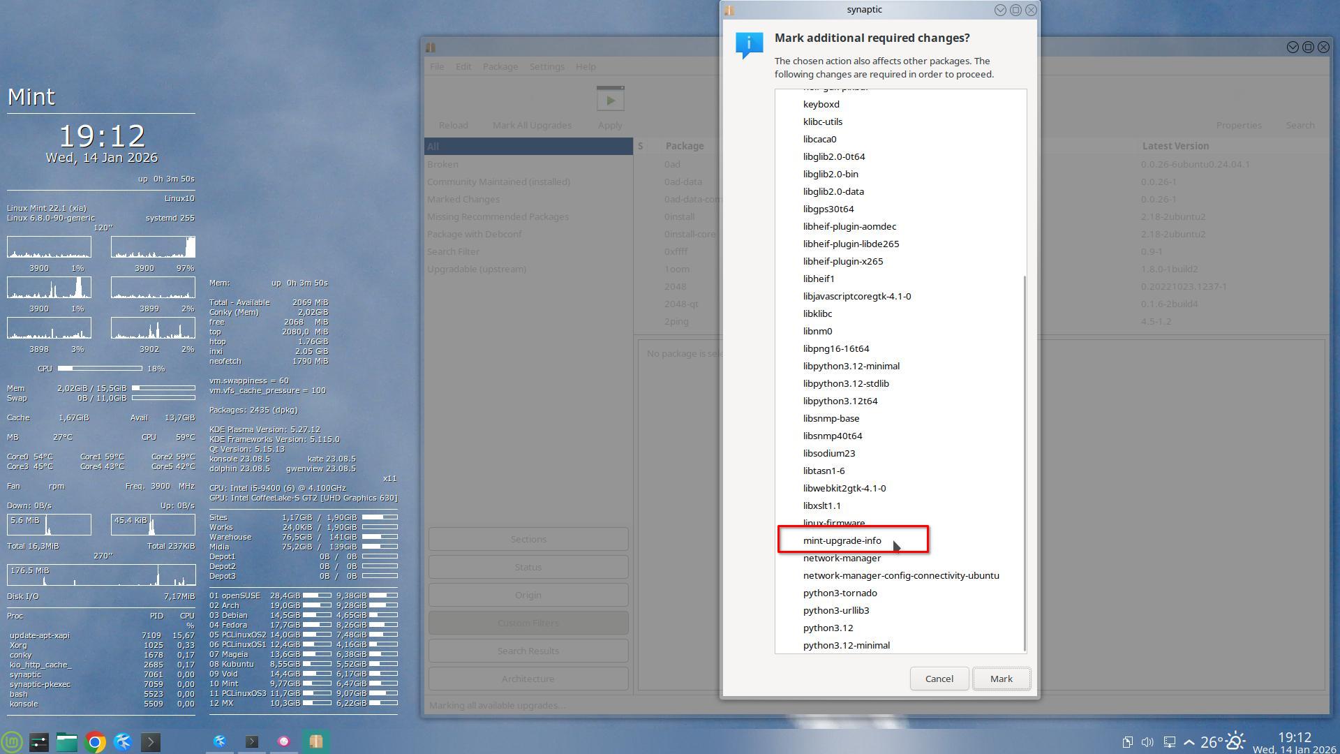 Executei um sudo apt update, vi que o espelho (mirror) estava Ok – e apliquei as 47 atualizações pelo Synaptic. – Sempre atualize completamente o sistema, antes de começar um upgrade de versão: