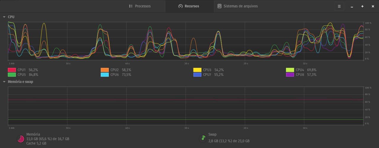 Pelo gráfico que você postou no monitor do sistema, parece que o seu SO já está utilizando o swap. Você chegou a verificar qual processo está consumindo tanta memória?