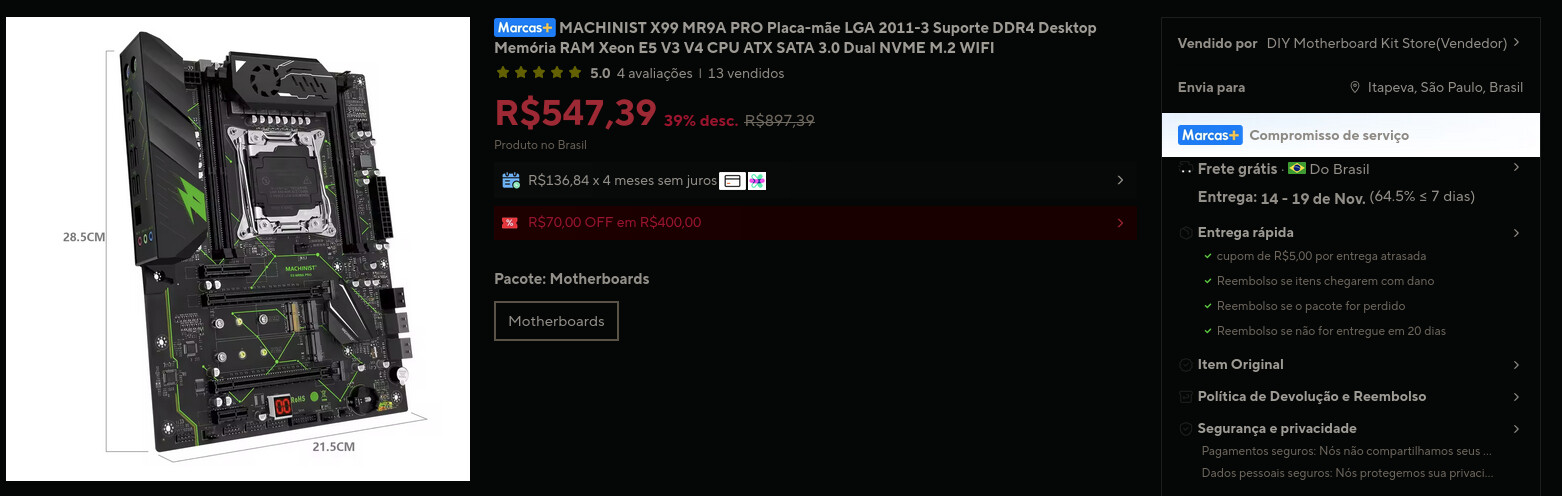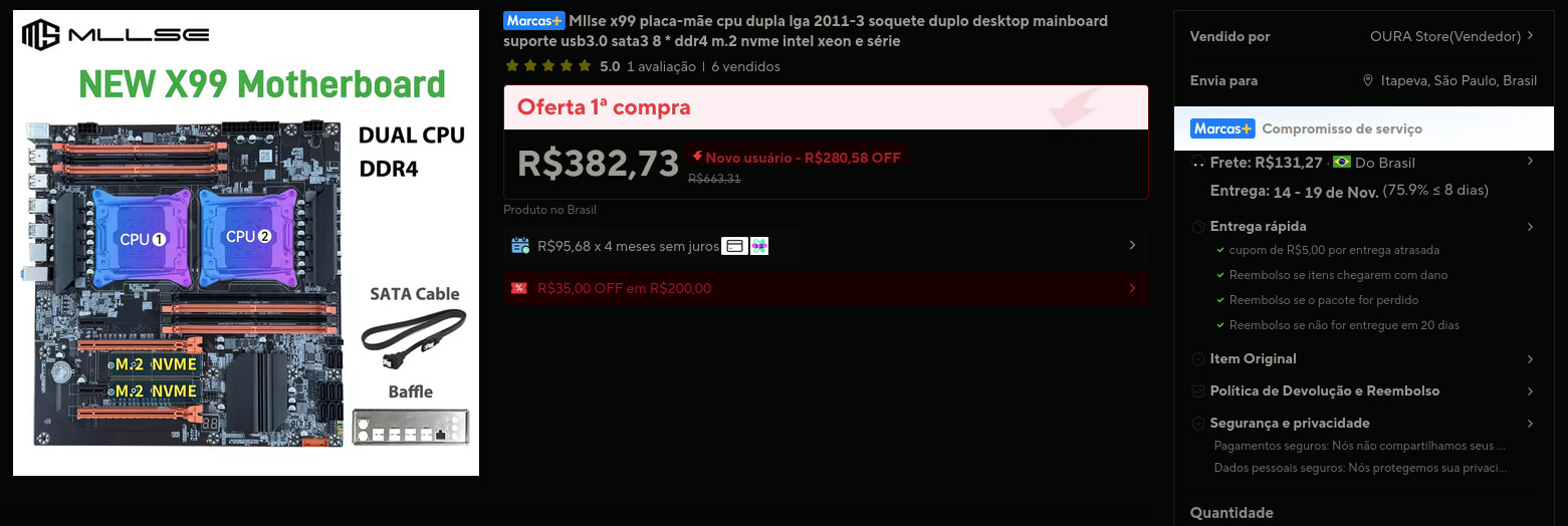 Esta plataforma X99 considerando apenas placa-mãe + 2 CPU E5-2680v4 saiu por aproximadamente R$ 850,00 no Aliexpress, as memórias eu já tinha.