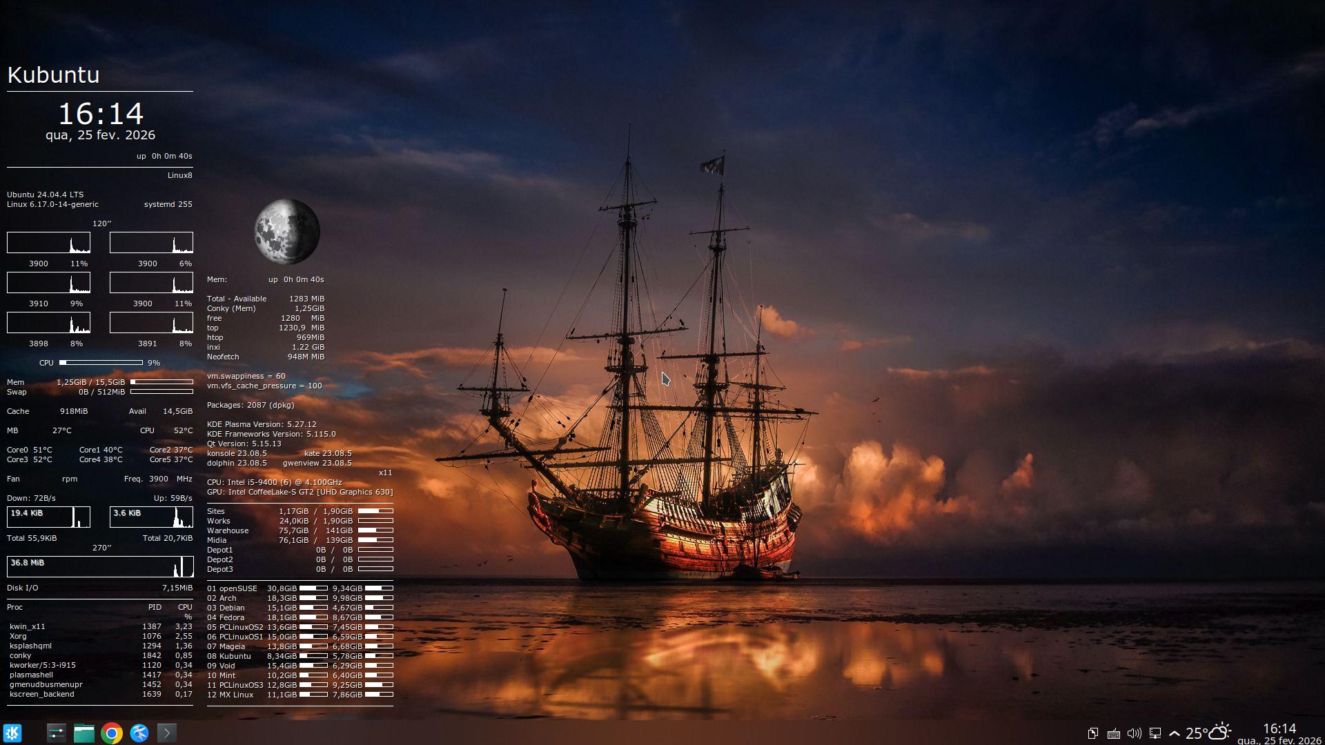 Por enquanto, adiei o Slackware e o Gentoo (talvez para sempre). – Atualmente, me interessaria experimentar o Artix – mas primeiro tenho de acabar umas “brincadeiras” com Kubuntu, Mint e PCLinuxOS, pra liberar espaço (e tempo).