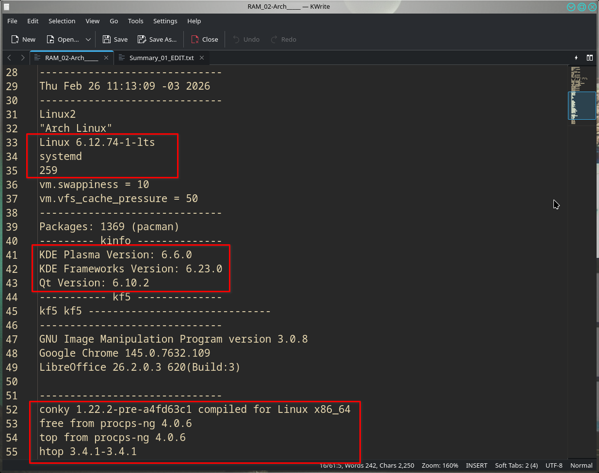 A 3ª ação (aos 6 minutos uptime) é executar um script chamado “VERSIONS.sh”, que registra no arquivo TXT as versões dos vários softwares, naquela data: – Kernel, SystemD (ou SysV, ou Runit), KDE Plasma etc. – e outras informações:
