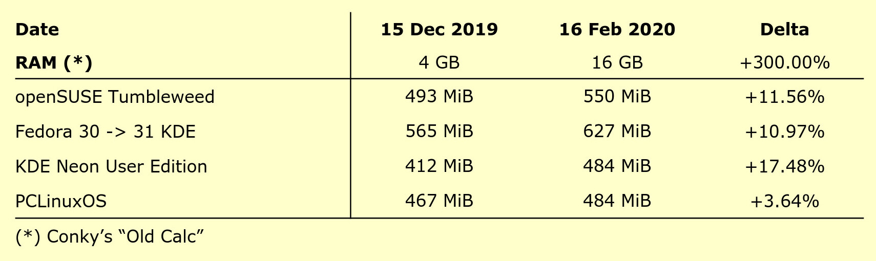A única certeza possível, é que todas as distros aproveitaram a RAM extra, para usar um pouco mais.