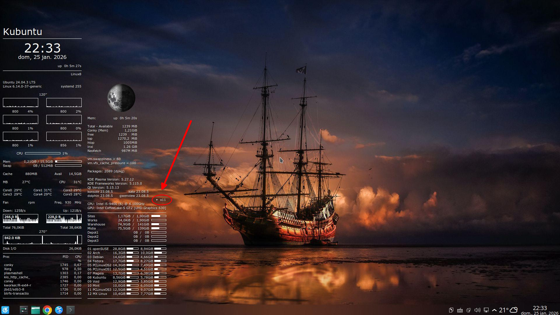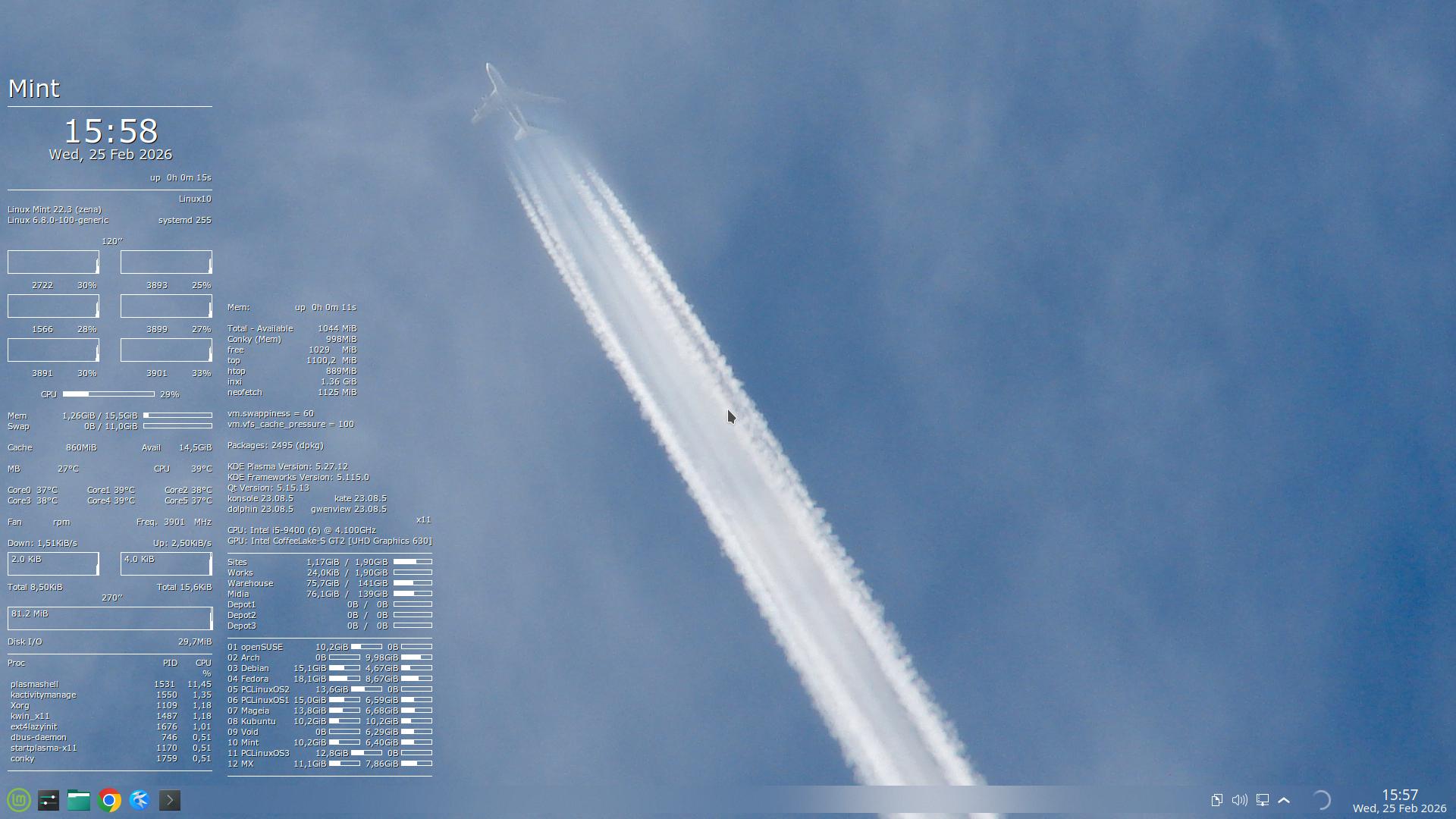 Se eu abrisse o Konsole no início da sessão, isso já aumentaria o uso de Memória RAM. – Organizei para não abrir nenhum aplicativo, até os 5 minutos uptime. – Pelo mesmo motivo, desativo a verificação de atualizações (PackageKit, Discover, mintUpdate) e removo a suíte PIM, para igualar todas as distros.