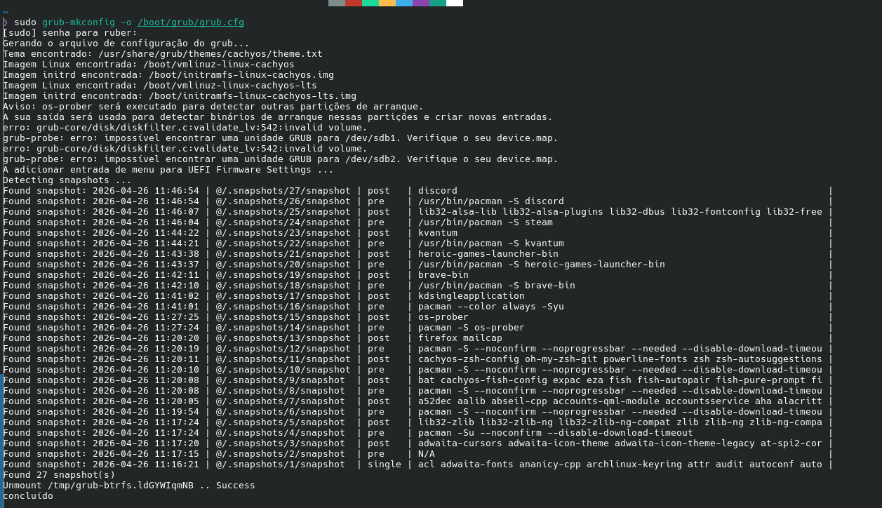 Pessoal sou novo no Mundo do Pinguin, poderiam me ajudar ? Segui tutotial a risca no Youtube de instação Cachy OS em dual Boot com Windows 11, fiz todos os procedimentos para no Grub detectar o Windows pós instação mais infelizmente não detecta. Poderiam me socorrer ?