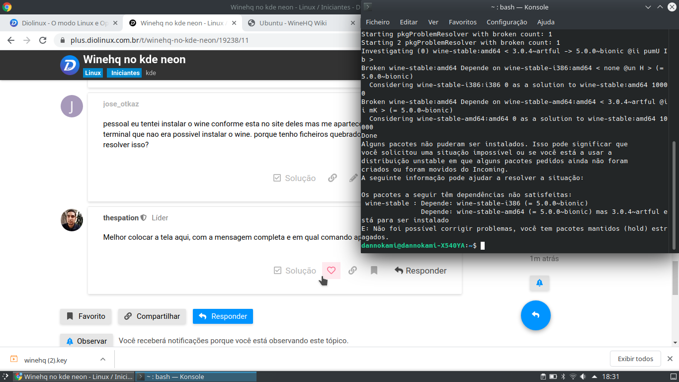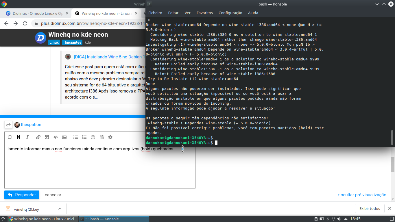 pessoal eu tentei instalar o wine conforme esta no site deles mas me aparteceu uma mensagem no terminal que nao era possivel instalar o wine. porque tenho ficheiros quebrados ah alguma maneira de resolver isso?