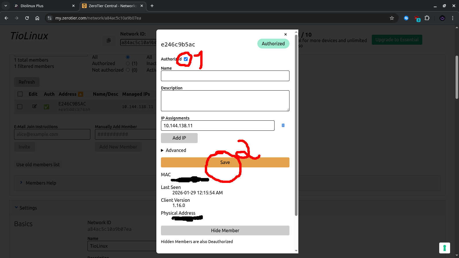 7 - Para autorizar, clique na caixa Authorized (1) e depois em Save (2).