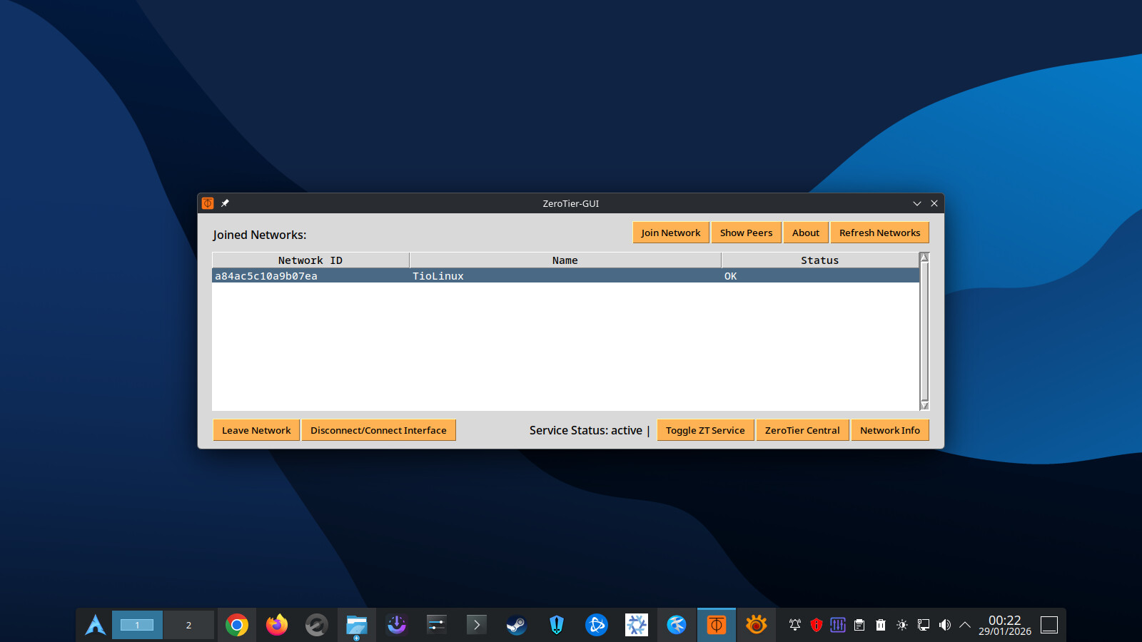 1 - Instale o Zero Tier conforme a página oficial manda aqui, o gui dele pode ser instalado seguindo o tutorial aqui (no Arch, sudo pacman -S zero-tier-one && yay -S zerotier-gui-git).
